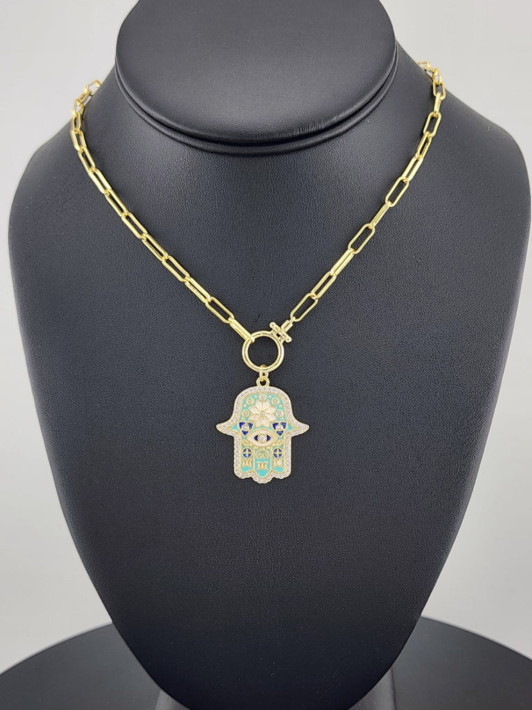 The highlight is the stunning Hamsa pendant, adorned with sparkling cubic zirconia stones and vibrant enamel detailing in shades of blue, white, and light blue-green. The Hamsa symbol is a timeless emblem of protection, peace, and good fortune – beautifully reimagined in a fresh, contemporary design.