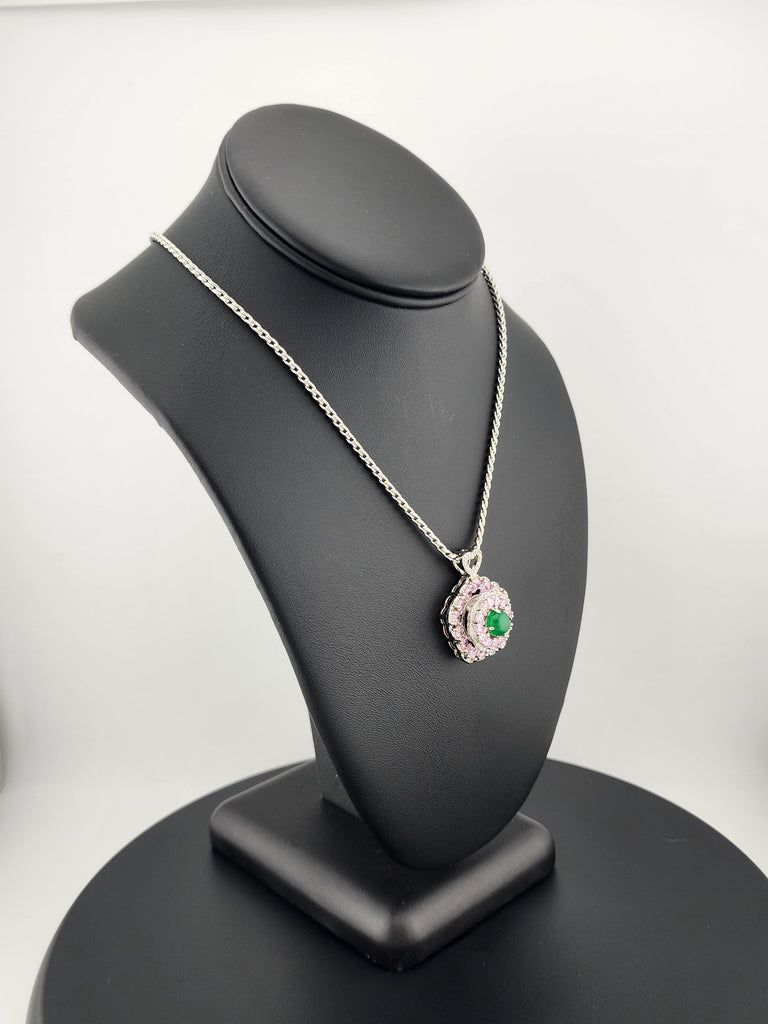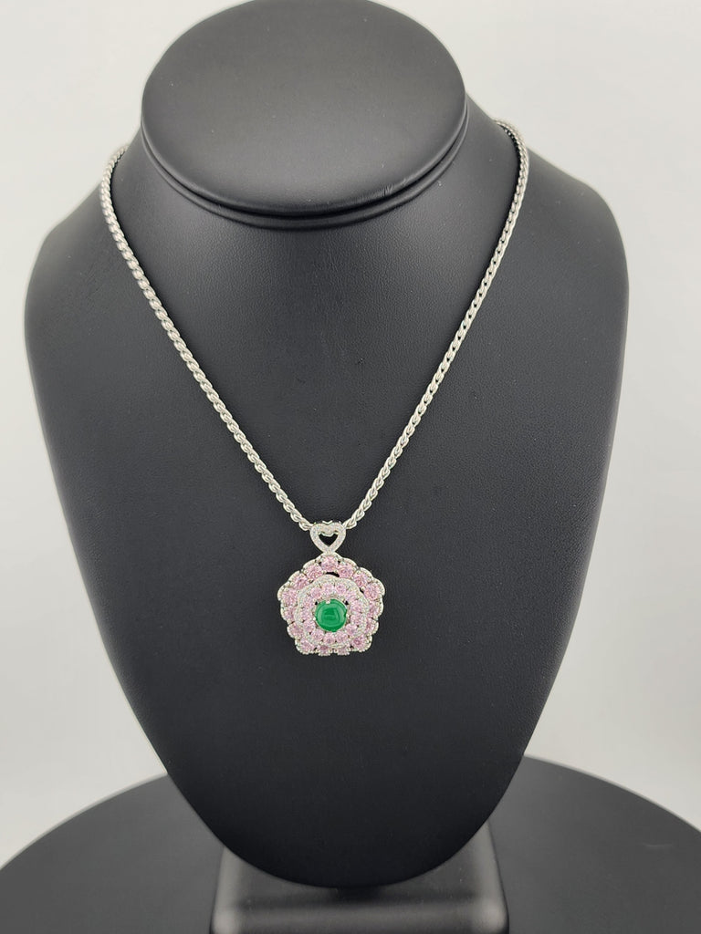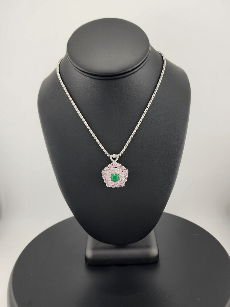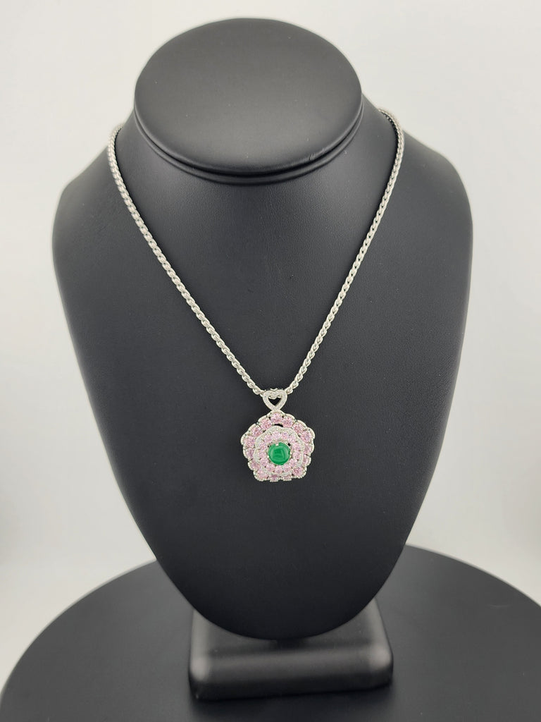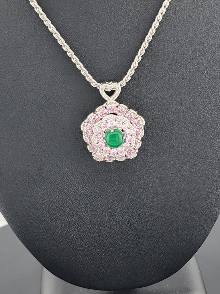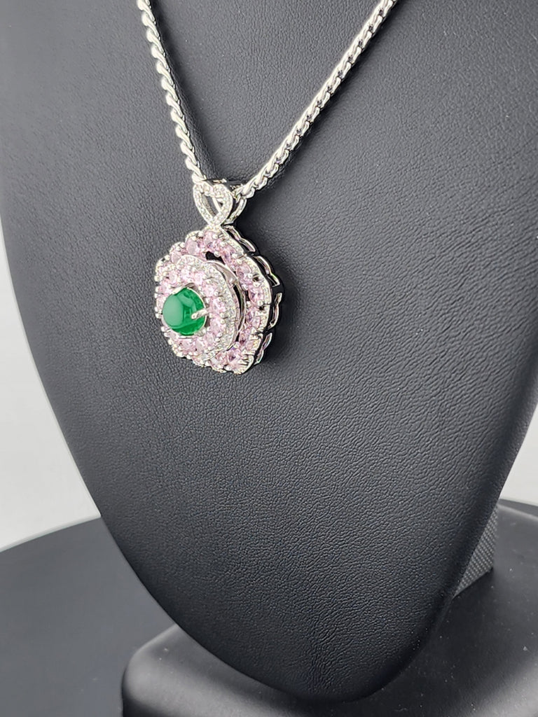 This standout piece features a brass spinner pendant with a smooth, rotating design. At the center lies a calming round jade stone, surrounded by shimmering pink gemstones that add a touch of color and charm. The pendant hangs from a durable 20-inch stainless steel chain, offering a modern contrast to the warm brass tones.