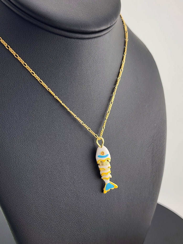 Add a splash of playful charm to your jewelry collection with the Catch of the Day: White Fish Necklace. This whimsical pendant features a vibrant blue, white, and orange enamel finish, bringing the little fish to life with a pop of ocean-inspired color.