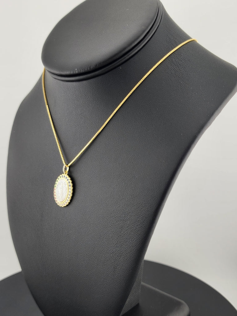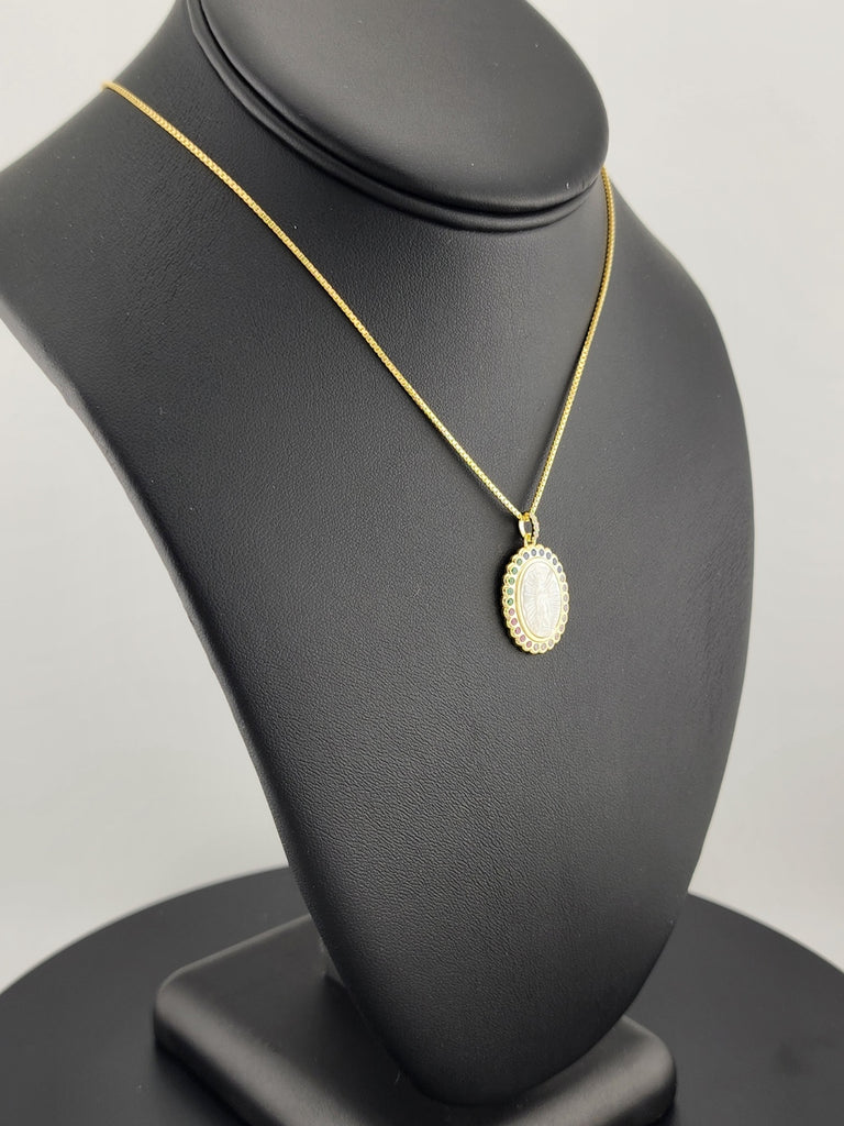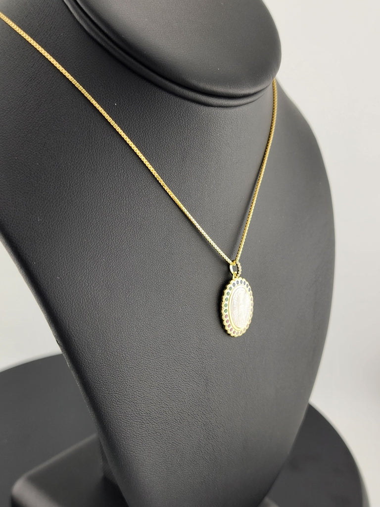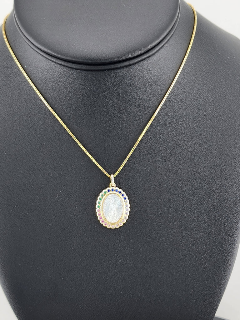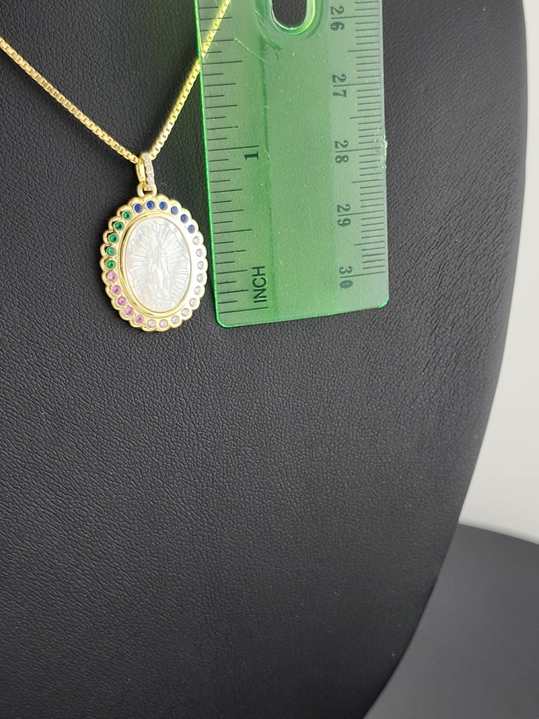 Celebrate your faith with elegance and color in this 925 Sterling Silver Virgen Necklace, featuring a radiant blend of materials and craftsmanship. At the center of the pendant is a shimmering opal inlay with the image of the Virgen, beautifully surrounded by vibrant multicolor gemstones that bring the piece to life with spiritual and visual warmth.