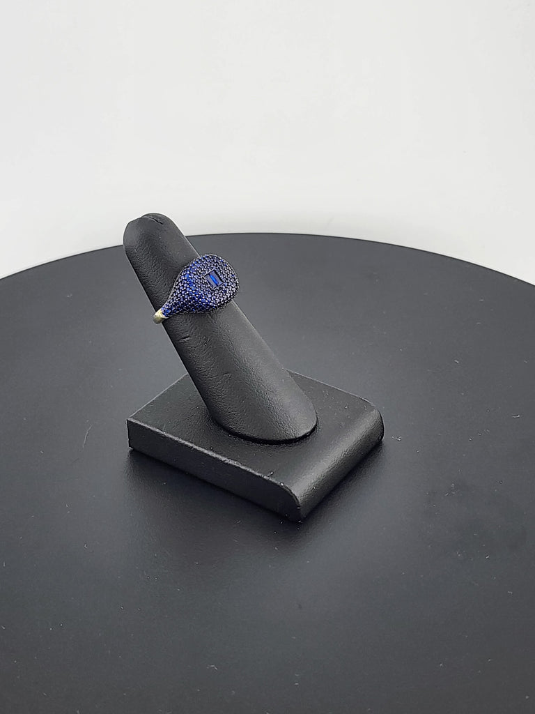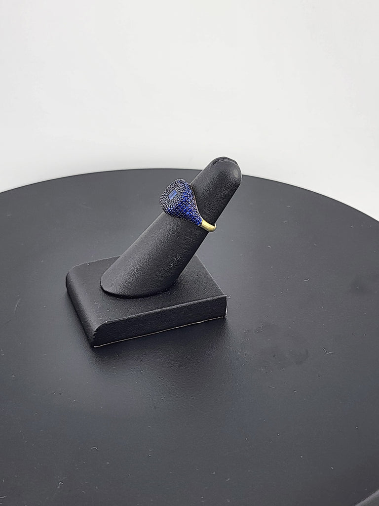 Make a bold and elegant statement with this eye-catching Crystal Blues ring. Crafted from 925 sterling silver and luxuriously gold-dipped, this stunning piece features a brilliant blue gemstone at the center, surrounded by sparkling Blue cubic zirconia stones that catch the light from every angle.