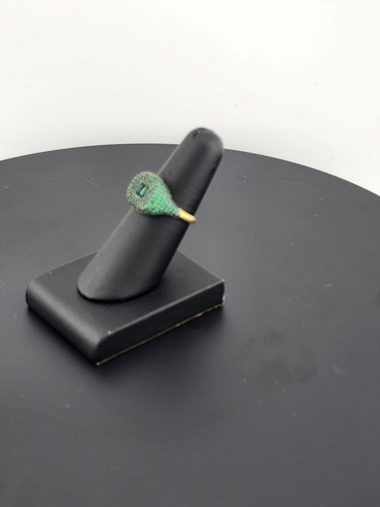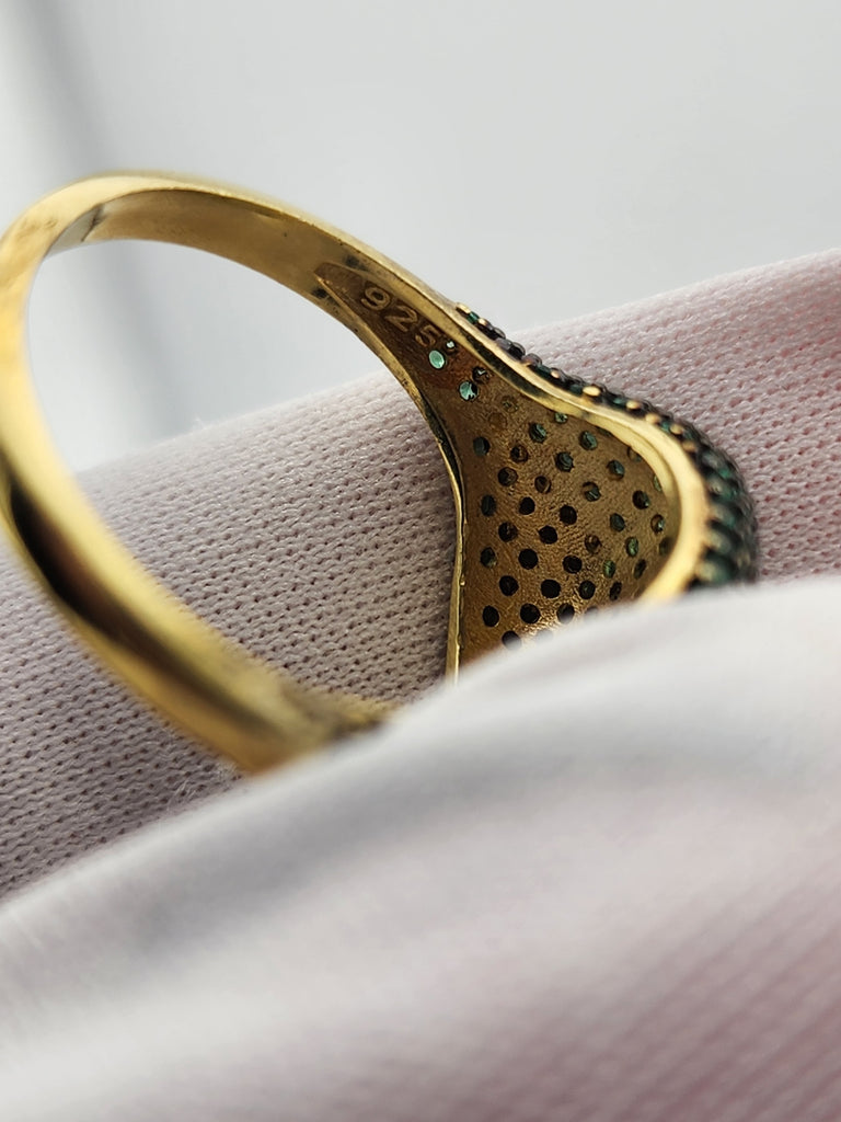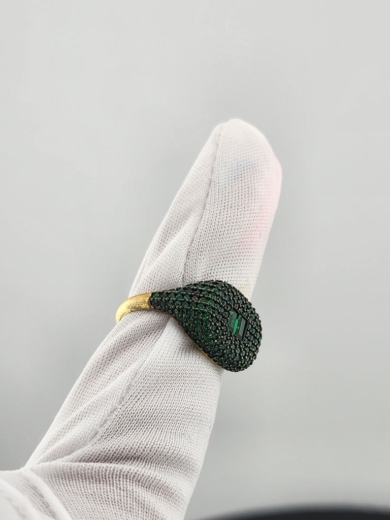 Make a bold and elegant statement with this eye-catching Crystal Green ring. Crafted from 925 sterling silver and luxuriously gold-dipped, this stunning piece features a brilliant Green gemstone at the center, surrounded by sparkling Green cubic zirconia stones that catch the light from every angle.