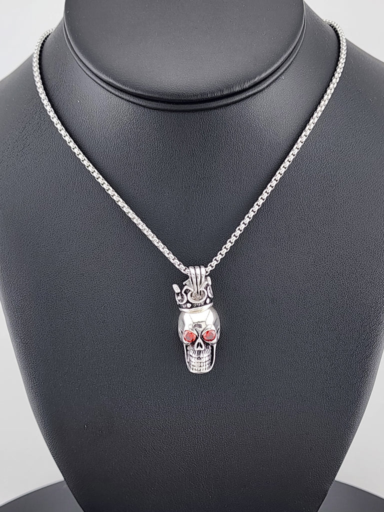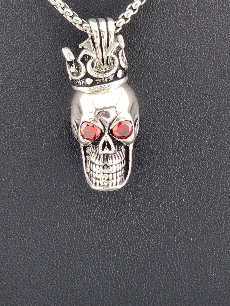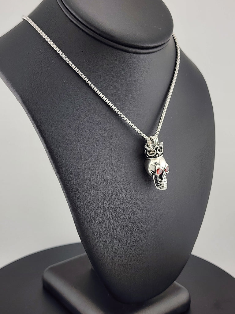 Embrace bold elegance with the Dark Royalty Necklace — a powerful fusion of gothic edge and regal design. Featuring a finely crafted sterling silver 925 skull pendant with piercing red gemstone eyes, this piece commands attention. Atop the skull sits a removable 925 sterling silver crown, adding a versatile and dramatic flair.