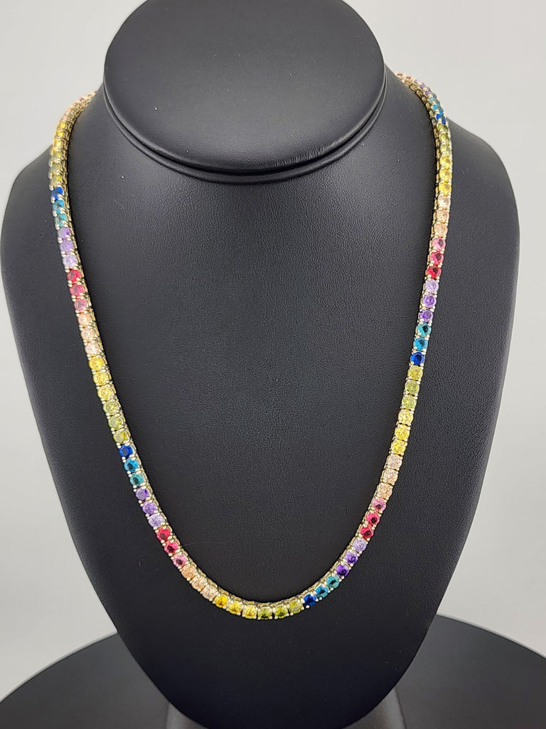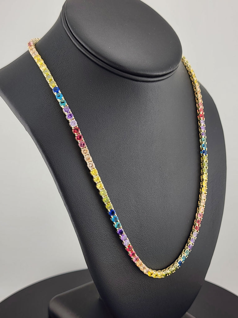 Bold Color, Classic Elegance Make a vibrant statement with the Rainbow Radiance – Sterling Silver Multi-Gemstone Tennis Necklace. Crafted from genuine 925 sterling silver, this dazzling piece features a continuous line of brilliant, multi-colored gemstones that create a radiant, rainbow effect—perfect for adding color and charm to any outfit. Whether worn alone or layered, this 20-inch necklace brings together timeless tennis style with a fresh, modern twist. Material: Solid 925 sterling silver Stones: Multi-color gemstones (rainbow style) Length: 20 inches – ideal for a classic, close fit