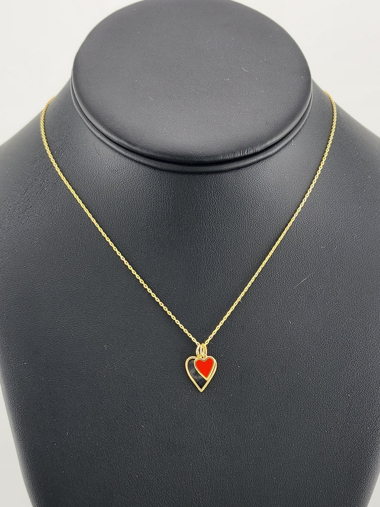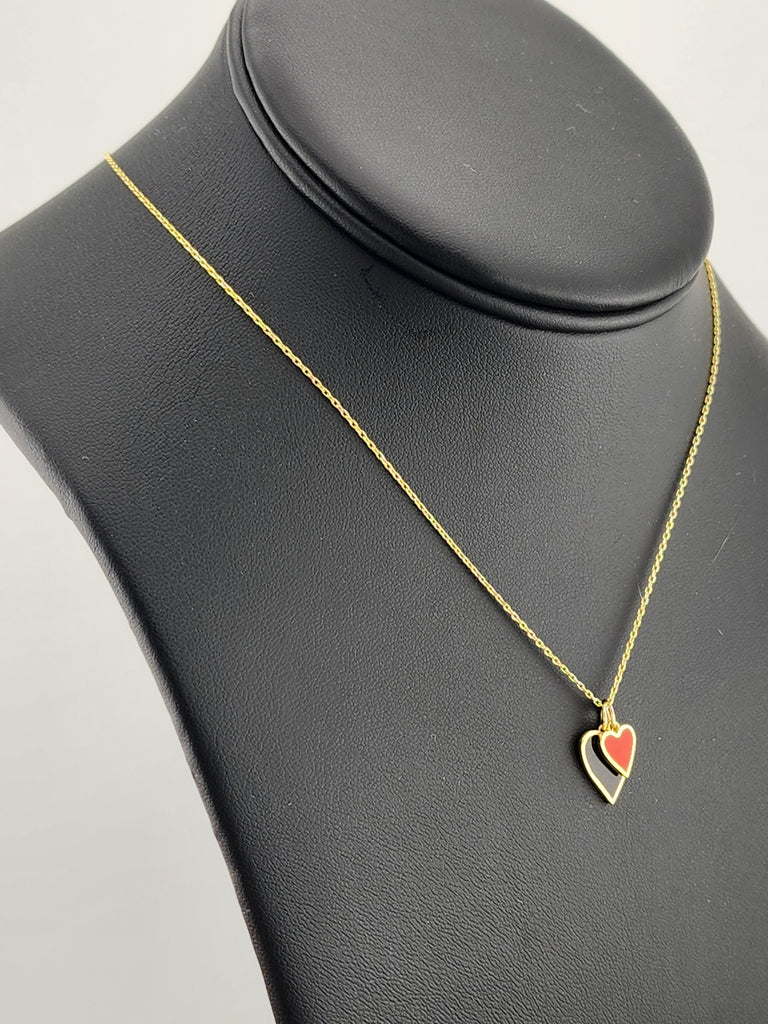 Express elegance and love with this stunning double heart necklace, crafted from genuine 925 sterling silver and beautifully dipped in gold for a luxurious finish. The pendant features two contrasting hearts—one adorned with sleek black enamel, and the other accented with bold red enamel—creating a striking and symbolic design.